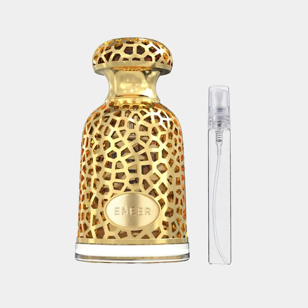 Emeer de Lattafa Perfumes es una fragancia de la familia olfativa Amaderada Aromática para Hombres y Mujeres. Esta fragrancia es nueva. Emeer se lanzó en 2024. Las Notas de Salida son limón (lima ácida), bergamota, esclarea y bayas de enebro; las Notas de Corazón son té Blanco, sándalo, cardamomo y incienso de olíbano (franquincienso); las Notas de Fondo son ámbar gris, cedro, cachemira y pachulí.